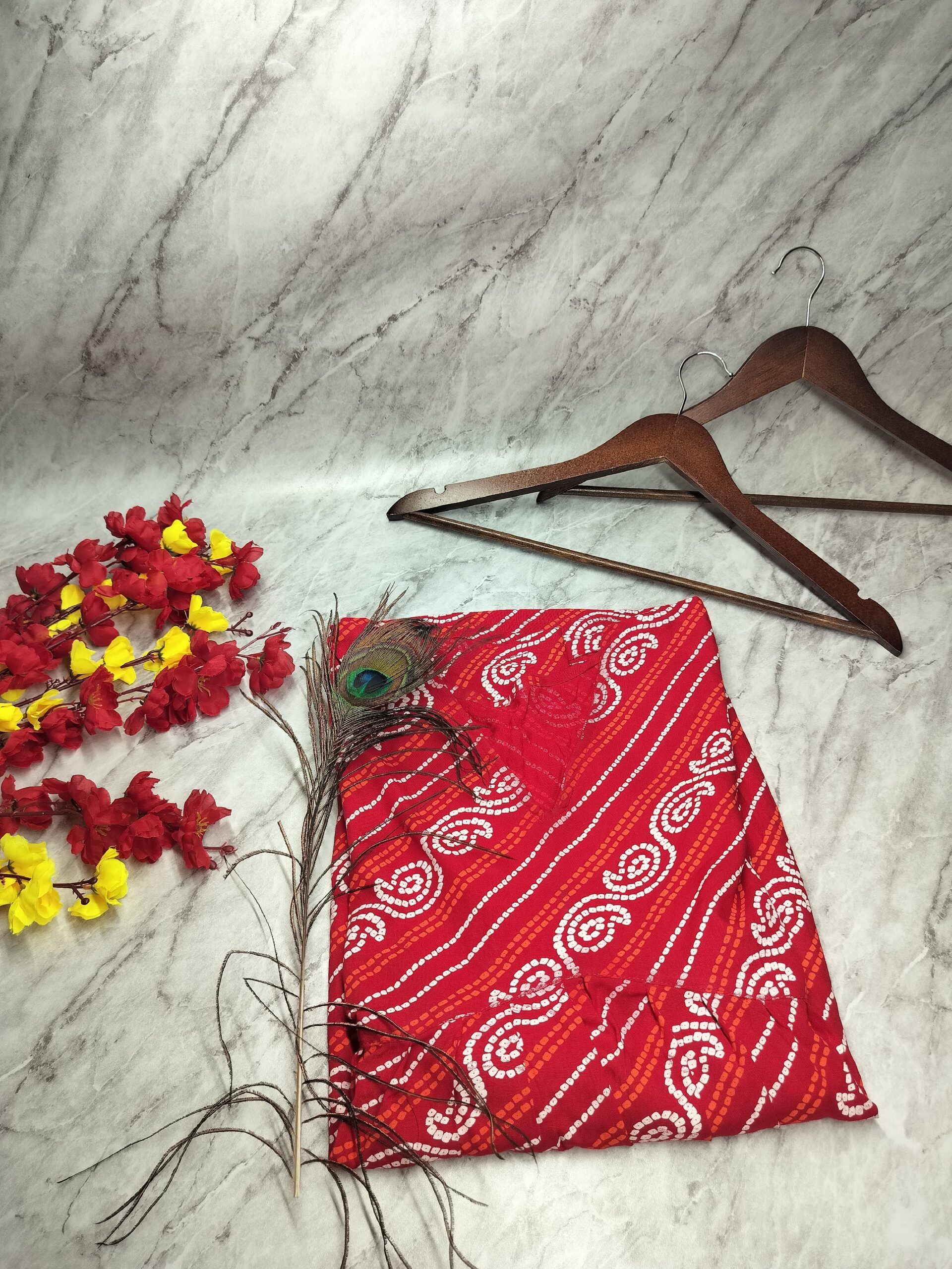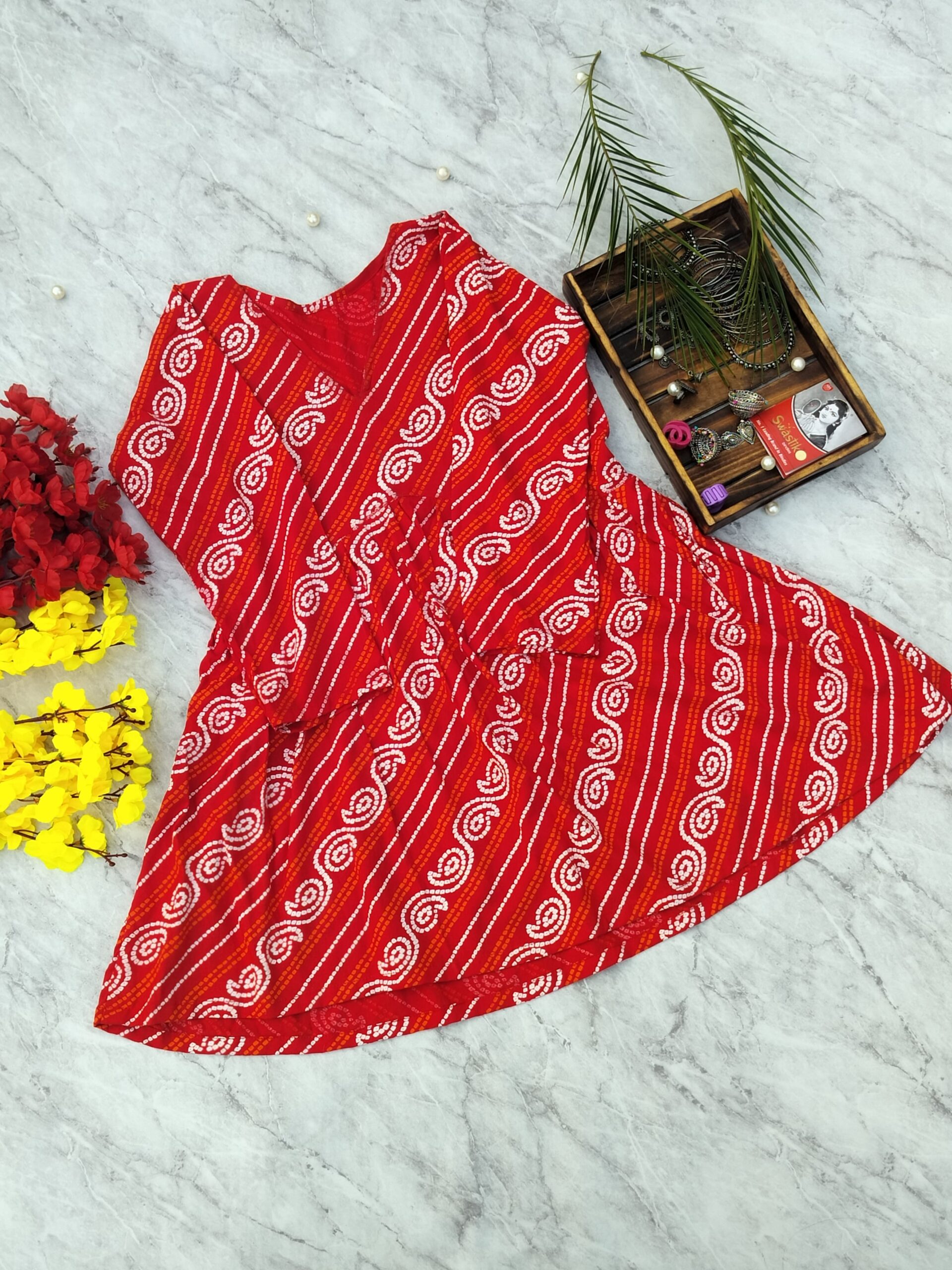 The garment features a stunning combination of fiery red and bright white in the classic diagonal leheriya (wave-like) stripe pattern interspersed with intricate circular or spiral motifs. It has a slightly fitted bodice with an elasticated or cinched waist that flows into a flared, A-line or peplum hem, giving it a playful and feminine silhouette. The neckline appears to be a flattering V-neck or a simple round neck with a small v-cut.